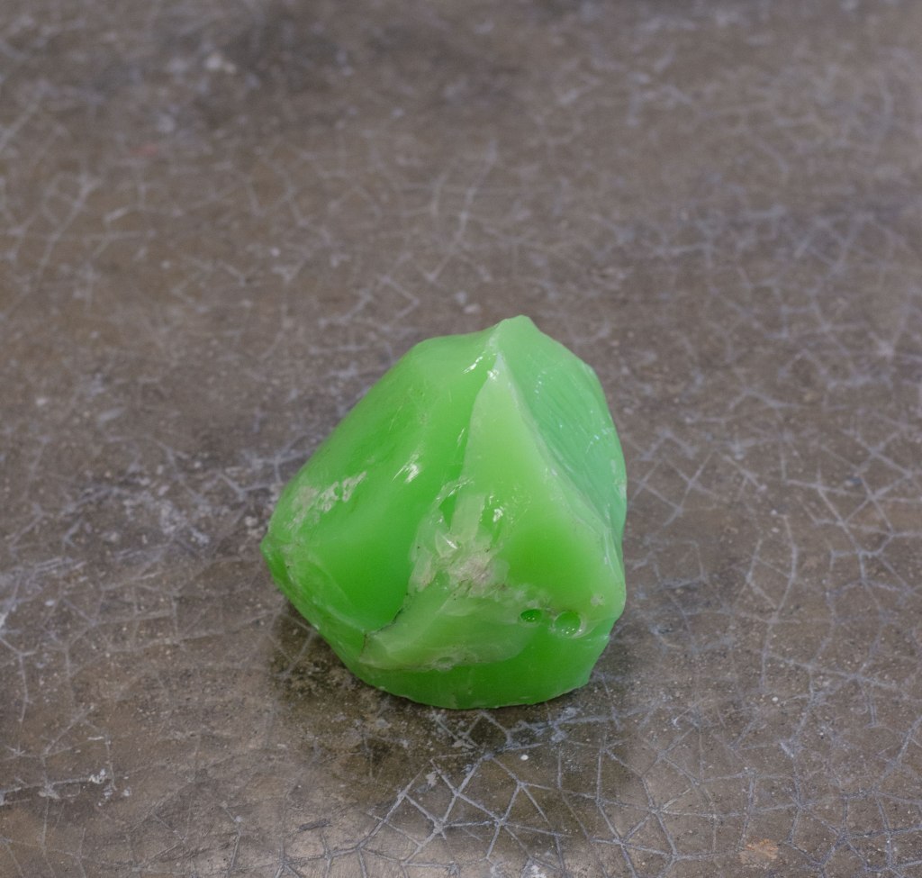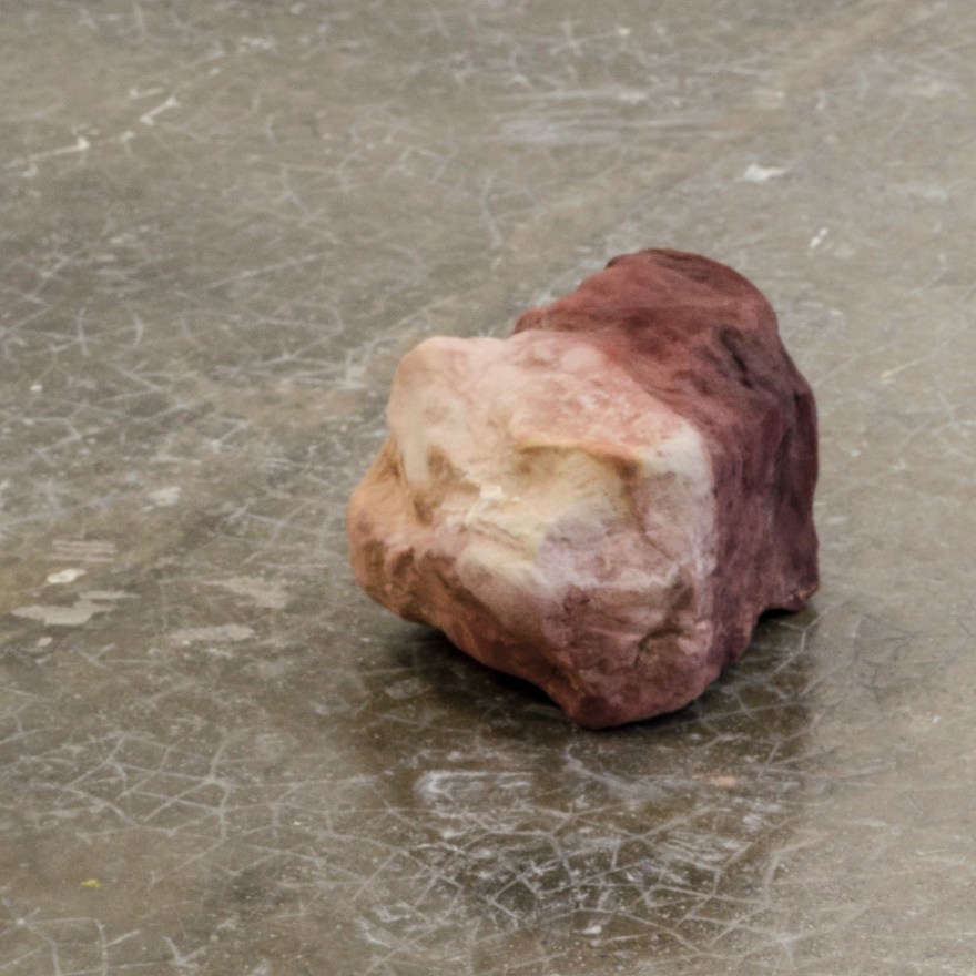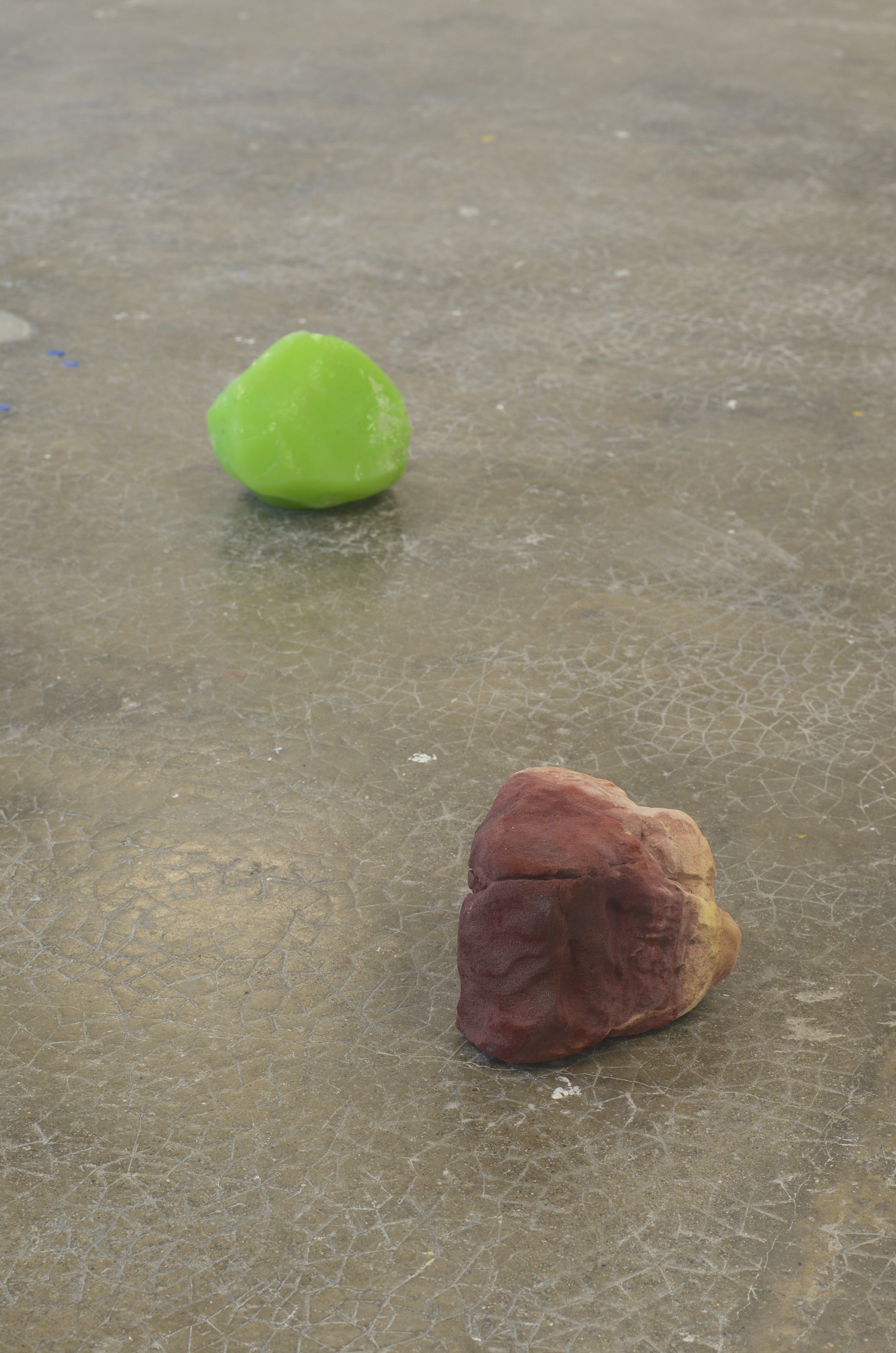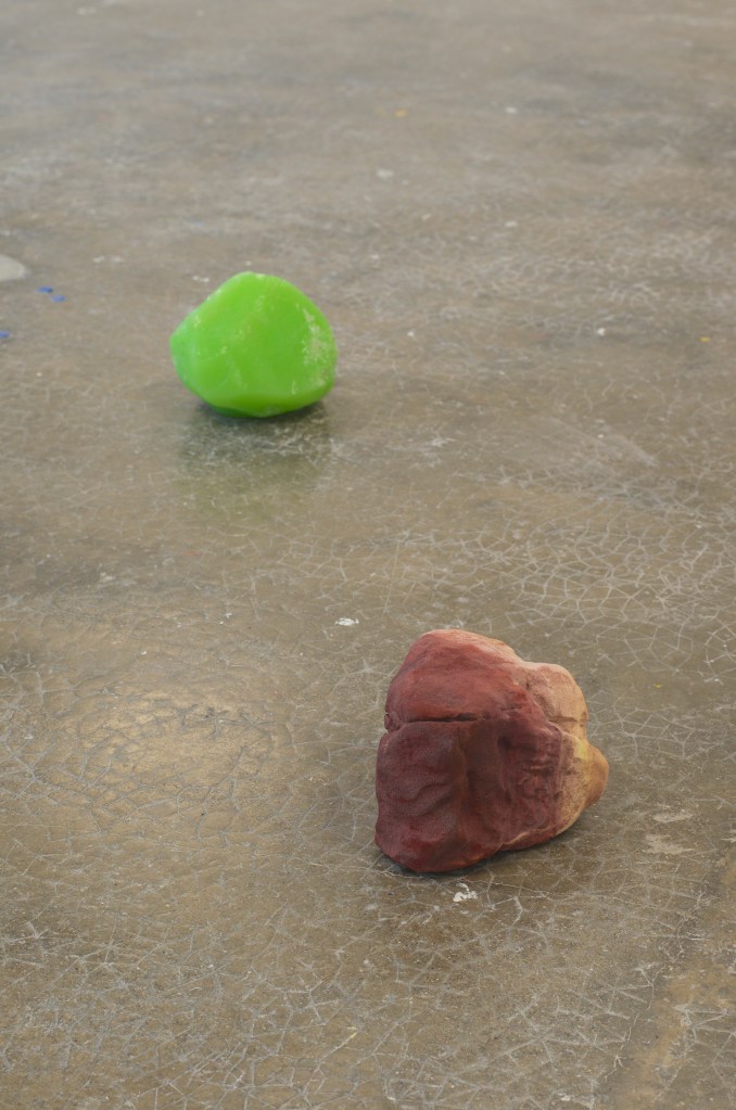 À terre, des objets trouvés. Pour moi ce sont un peu des pierres inconscientes de l’homme. Créées par l’homme à son insu. Des rebuts de l’homme, des parties qui n’ont pas su satisfaire leurs créateurs soit l’artisan, soit l’ouvrier ou qui en tout cas ont été désignées hasardeusement entant que surplus. J’ai voulu les désigner, leur donner un nom, les baptiser, leur donner de l’importance, qu’elles puissent sortir de l’oubli. Leur dénomination s’est faite en fonction du lieu d’où elles ont été extraites et construites : Murano pour la pierre de verre, Bédoin pour la pierre de sable. Ces deux matériaux se sont transformés une fois livrés à l’eau dans le paysage, les vagues de Murano ont poli le verre du souffleur et la pluie et les éboulements ont séparé de sa masse Bédoin. C’est cela qui a fait que j’en suis venue à récolter cet agglomérat d’ocre sous ces proportions. Il y a l’opposition de deux formes de même grandeur, qui sont composées du même matériau qui ont toutes deux été extraites de leur environnement pour finalement y être abandonnées. Dans un même temps il y a un deux matériaux qui ont été modifié, ce qui a altéré sa composition, sa tenue, et créé une forme solide qui se tient, face à un agglomérat superficiel qui peut redevenir sable à tout moment.