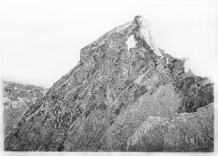 Ce dessin a été exécuté d’après une photographie de l’alpiniste Nirmal Purja. Elle à été prise en mai 2019, sur le haut de l’Everest dans un moment où les grimpeurs se retrouvent coincés les uns derrière les autres à l’arrivée du sommet. L’attente se fait longue, l’oxygène manque, certains d’entre eux ne redescendront jamais. La photographie originale est en couleur et permet de distinguer très nettement une colonne de blousons multicolore, une ligne d’alpinistes qui se pro le jusqu’au sommet. Le passage au noir et blanc ainsi que la reproduction au rottring sous forme de multitudes de points mélange les textures et mêle les grimpeurs à la montagne.
