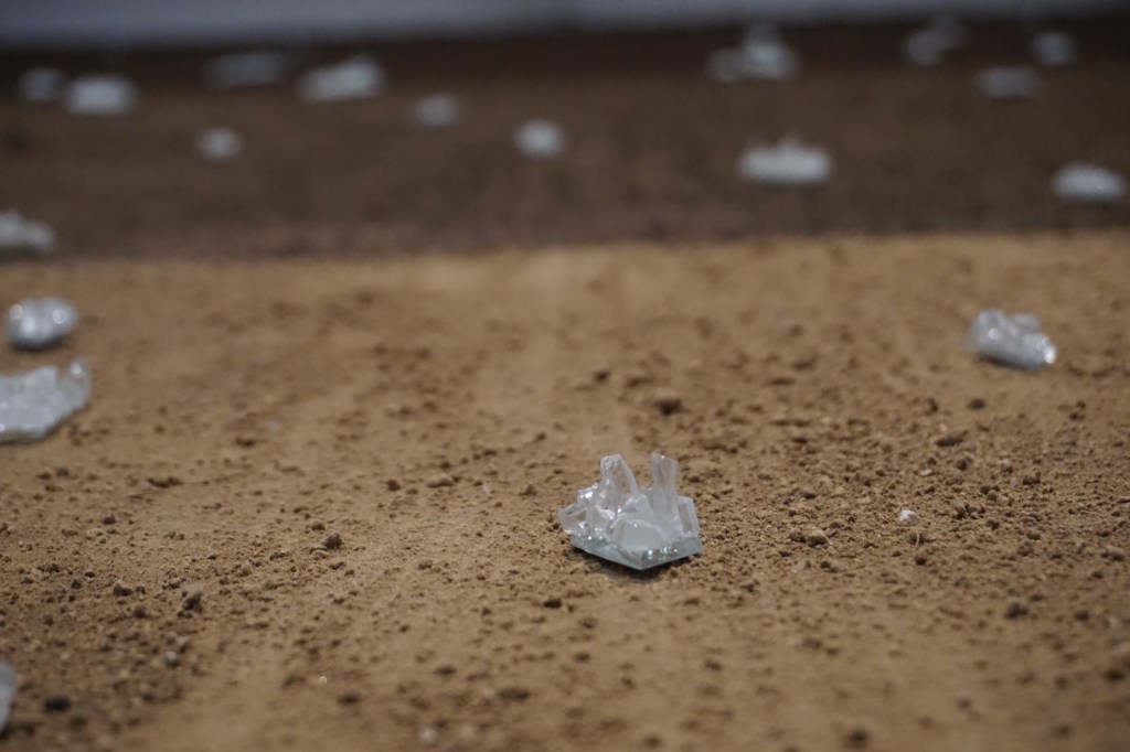 Avec En dessous de Popigaï, c’est une immersion dans les couches terrestres de ce cratère que nous propose Rebecca Brueder. Mais l’installation pourrait se dérober au regard de celui qui n’y prête pas attention. En effet, il faut laisser l’œil s’accommoder à l’obscurité et prendre le temps d’observer pour remarquer, incrustés dans les couches de terre, de petites pierres brillantes. Il ne s’agit bien sûr pas ici de vrais diamants, mais de verre sécurit adossé à de petits miroirs qui viennent évoquer la pierre précieuse. Le choix des matériaux n’est pas laissé au hasard par l’artiste, qui précise : « pour devenir sécurit, le verre est chauffé à très haute température avant d’être soudainement refroidi. Ce choc thermique crée des microfissures invisibles qui lui permettent de se briser en milliers de petits morceaux en cas d’impact important. Ce processus rappelle le baiser de l’astéroïde sur le sol de la Sibérie, créant le cratère de Popigaï et ses milliards de petits diamants. ».