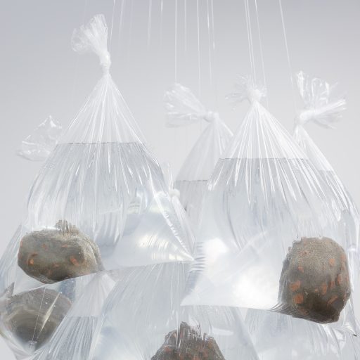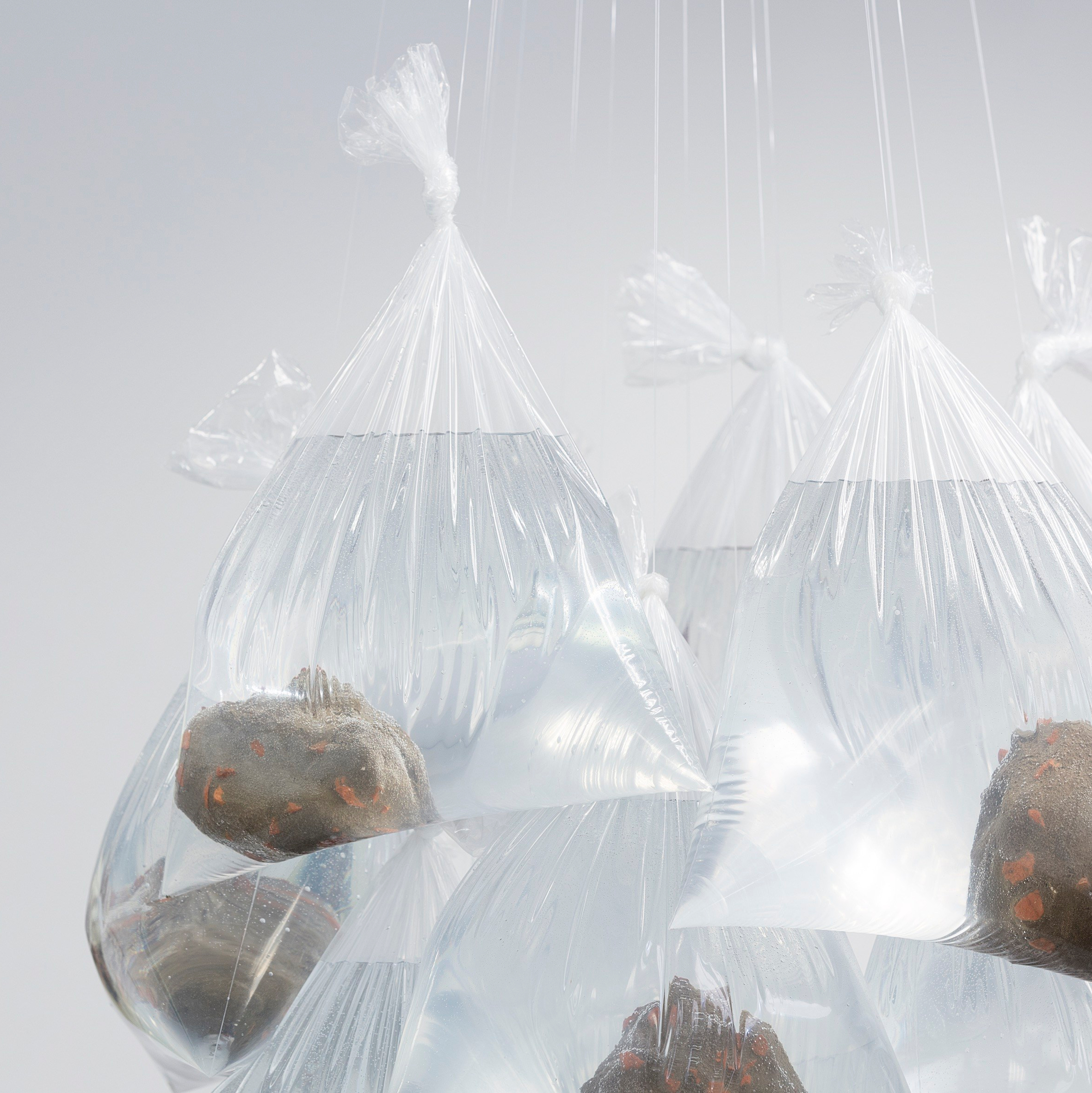 Briquomérats, 2018, brique, mortier, sacs plastique, eau, fil nylon, 103x67x67 cm